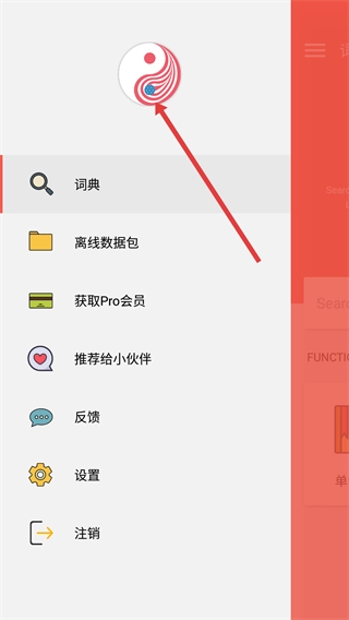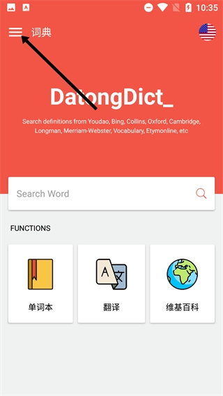 1、点击【DatongDict_】词典界面左上角的菜单按钮,展开功能菜单后,就能查看离线数据包、设置等相关功能选项。