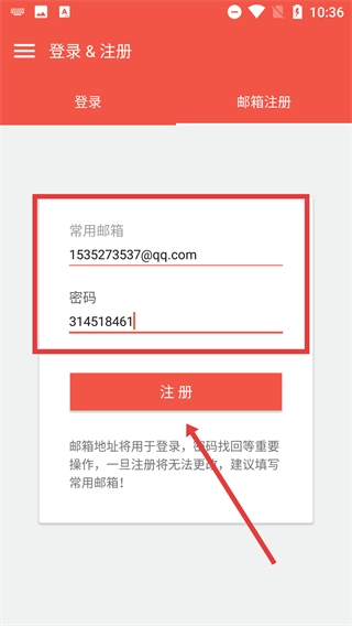 4、在邮箱注册表单里,填好【常用邮箱】和【密码】后,点击【注册】按钮就能完成账号注册,要注意邮箱一旦填写就无法更改的提示。