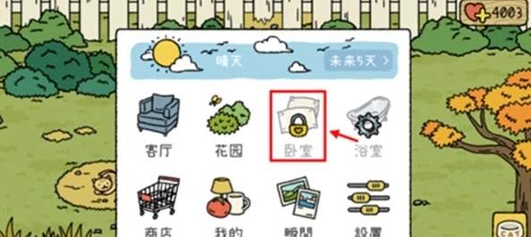 3、点击“卧室”选项,解锁该场景需要积累4000爱心值。解锁卧室是至关重要的一步,因为若未解锁这个新场景,将无法前往二楼。