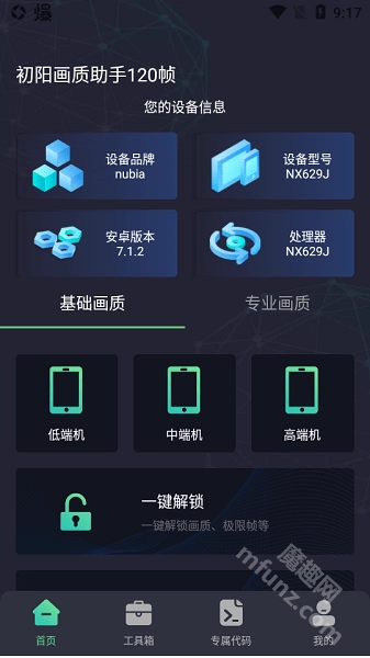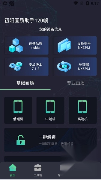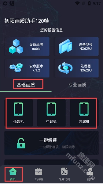2、打开初阳工具箱后,在基础画质界面,你可以依据手机配置情况或个人喜好,点击低端机、中端机或高端机对应的选项,这样就能完成画质切换了。