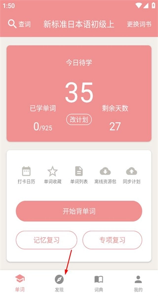 1、启动软件后进入单词板块,查看今日需学习的内容以及各项功能按钮,接着点击“发现”选项,进入该功能对应的页面。