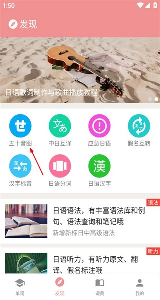 2、打开发现页面,浏览各类日语学习功能的入口,点击五十音图选项,进入对应的学习界面。