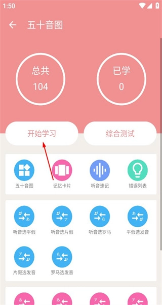 3、进入五十音图页面,查看学习相关的统计信息,点击开始学习按钮,进入具体的学习板块。
