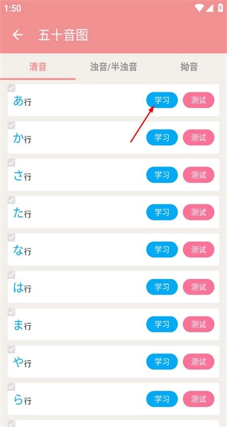4、进入五十音图清音学习页面后,找到对应行的学习按钮并点击,即可开始五十音图的学习。