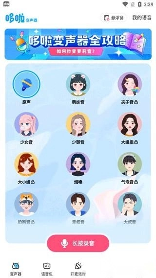 1、打开哆啦变声器,在变声器界面里有海量仿真网红音色可供挑选,选定你喜欢的音色后,长按就能进行录音;