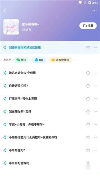 3、每个语言包内都包含多组语音内容,你可以随时随地点播收听,也能将这些语音分享给你的好友。