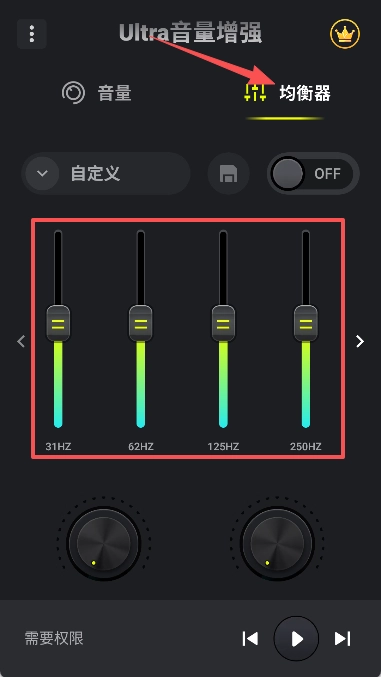 3、点击进入“均衡器”页面,即可对各个频段的音量进行调节设置。