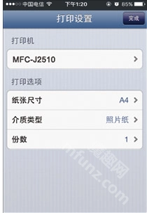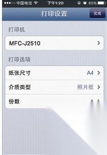 4. 选择打印机,并确定纸张尺寸、纸张类型和打印页数,然后点击“完成”即可。
