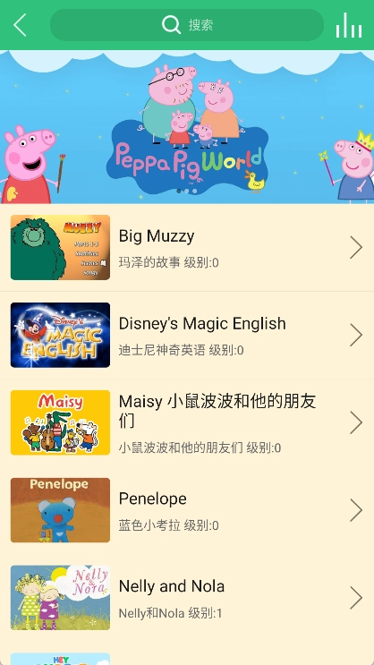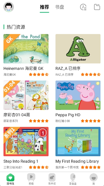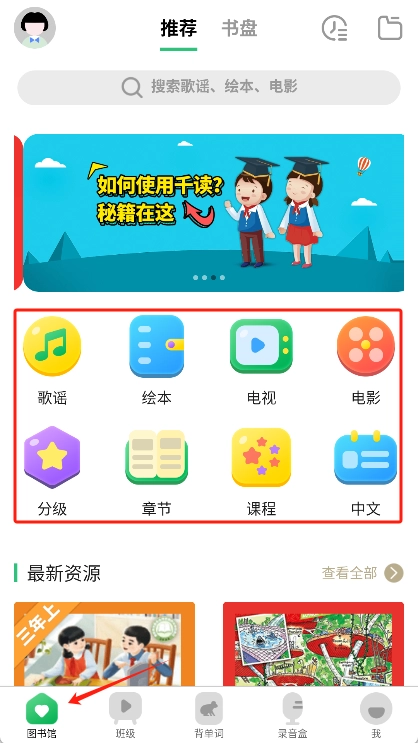 3、进入“图书馆”页面后,可选择歌谣或绘本等不同入口,再依据自身水平挑选一个内容。