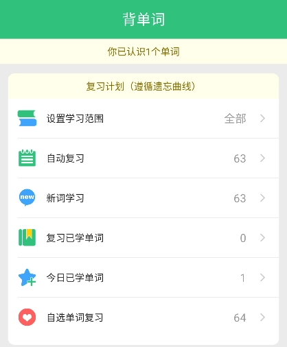 6、进入背单词页面后,用户可在此设置复习的范围与模式,该页面同时还配备了生词本功能。