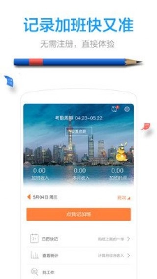 1、无需注册登录就能记录加班时长,登录后数据会自动备份上传,帮你彻底告别用纸笔记录加班的麻烦。
