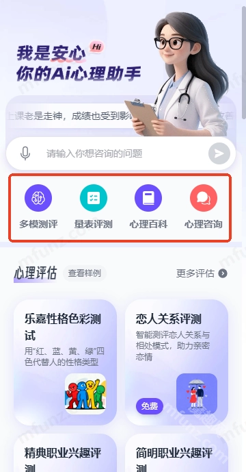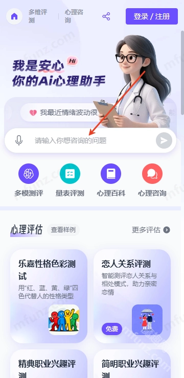 安心Ai是一款专注守护你心理健康的专业智能心理服务助手。它的核心功能涵盖多模测评、量表测评、心理百科与心理咨询,依托国内领先的AI大模型及海量心理健康数据,为用户提供专业服务。进入安心Ai后,只需完成系统提出的问题,就能快速分析你的情绪状态,并依据评估结果给出专业建议!