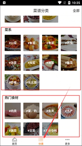 3、“分类”页面涵盖了食材分类、菜系分类等各类菜品分类,内容齐全,便于用户快速查找所需菜品。