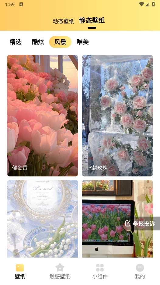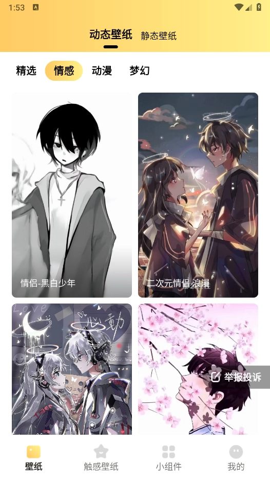 2、首页和“触感壁纸”板块都提供了丰富精美的壁纸资源,涵盖动态与静态两种类型,并且通过详细的分类设置,方便用户快速找到自己感兴趣的内容。