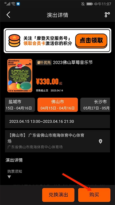 4、进入【购买详情】页面,仔细核对音乐节相关信息,选定取票方式后,点击【立即支付】按钮,完成支付操作即可成功购买学生票。