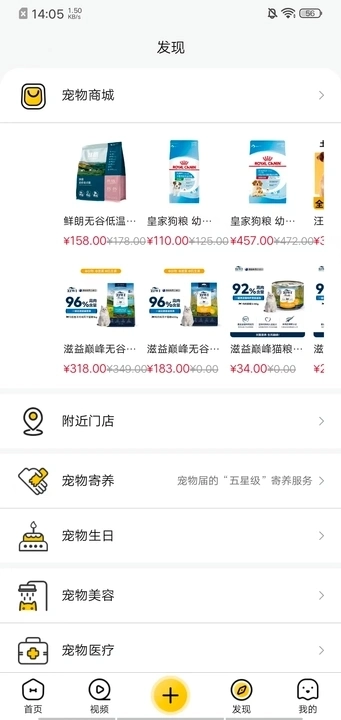 3、发现页面设有宠物商城、附近门店、宠物寄养、宠物生日等版块;