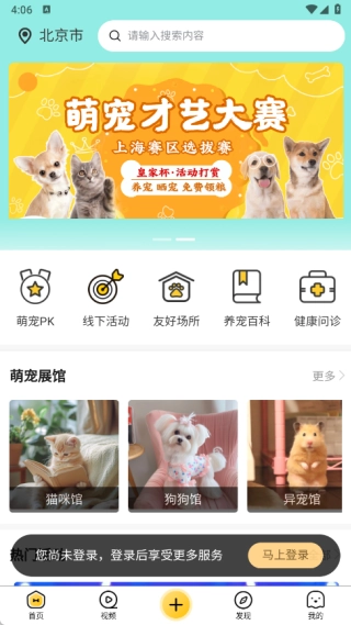 首页设有萌宠PK、线下活动、友好场所、养宠百科与健康问诊等版块,用户可同时了解萌宠展馆的功能。
