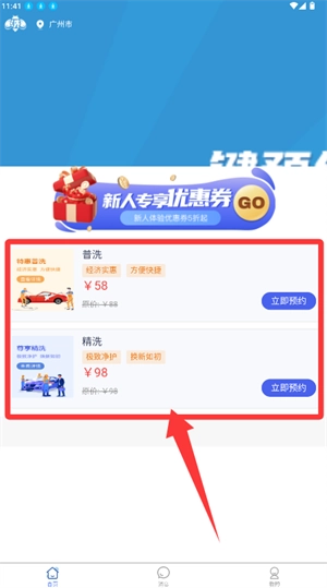 2、在首页选择普洗或精洗服务,点击立即预约。