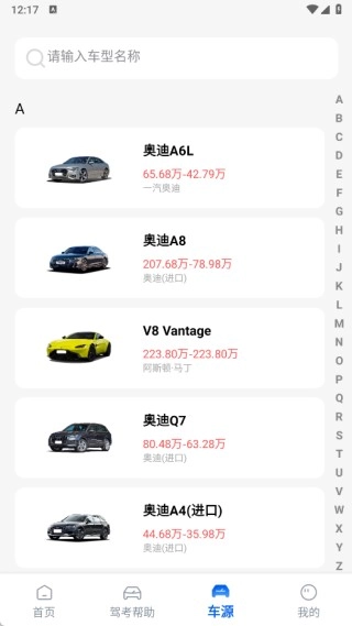 4、车源页面可了解各类汽车品牌信息,也可直接输入车型名称,精准查询对应车型详情。