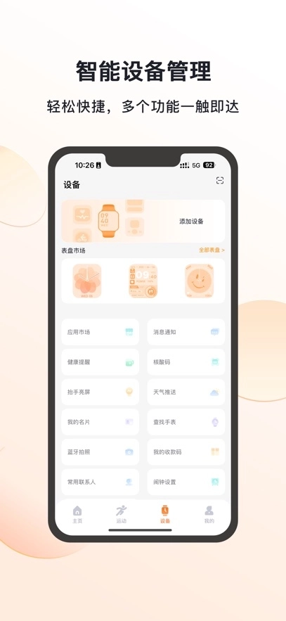 设备操控:具备手表查找、蓝牙拍照、天气推送、闹钟设置等设备管理相关功能