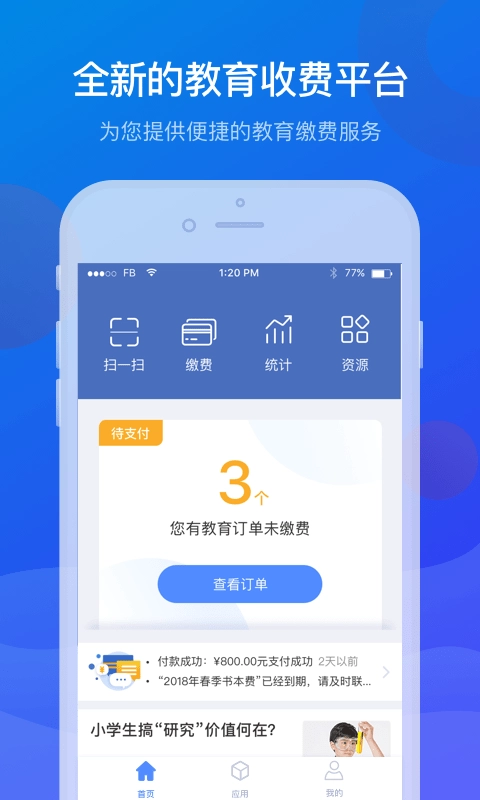 首页顶部的悬浮窗会滚动展示紧急缴费通知;班级缴费页面按照学号进行排序,并且支持对学生姓名进行模糊搜索;应用中心里设有成绩查询、请假等校园服务的入口;统计模块通过饼图来呈现各项目的缴费占比情况;生活服务区具备教材订购、研学活动报名的功能;