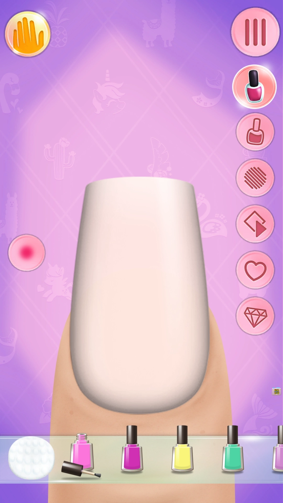 4、在细节操作页面,可借助右侧工具栏挑选甲油颜色、装饰图案等元素,给指甲打造个性化装扮。