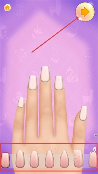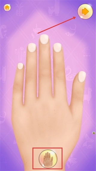 在美甲制作界面中,点击手部图标能够切换指甲的展示视角,而点击右上角的箭头按钮则可以进入美甲样式的选择环节。