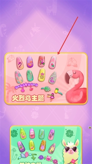 在美甲装扮类游戏的主题选择页面,点击【火烈鸟主题】套装所在的区域,就能进入美甲制作的操作界面。