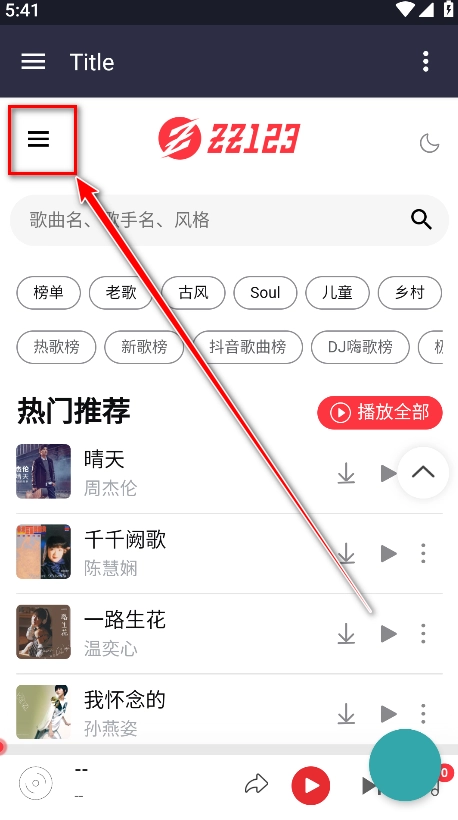 1、打开种子音乐进入首页,点击上方三横杠图标