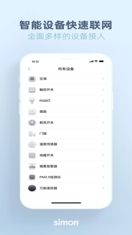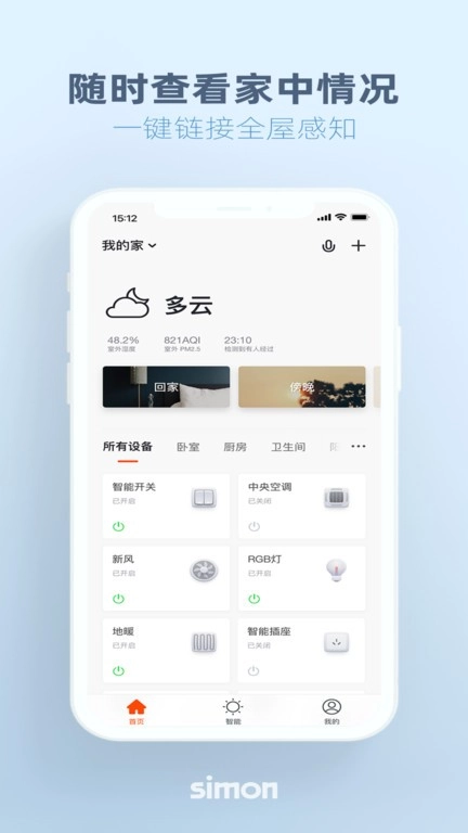 借助西蒙智享,所有智能硬件都能轻松掌控。实时状态查看、参数调整、场景定制、用户权限管理等功能应有尽有,让你的智能家居切实理解你的需求,为你提供贴心服务。