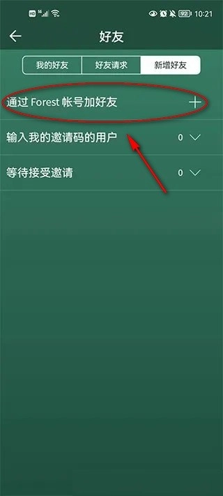 1. 打开Forest专注森林应用后,点击底部菜单栏中的“好友”选项,接着在好友页面找到“新增好友”按钮并点击,随后输入对方的Forest账号即可完成好友添加操作。