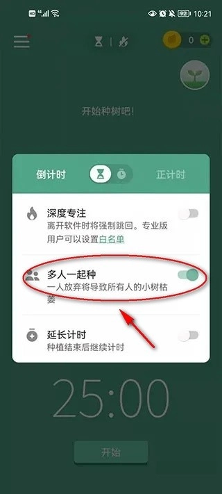 2. 好友添加成功后,返回首页,点击顶部的人形图标,此时会弹出模式选择界面,接着开启“多人一起种”功能。