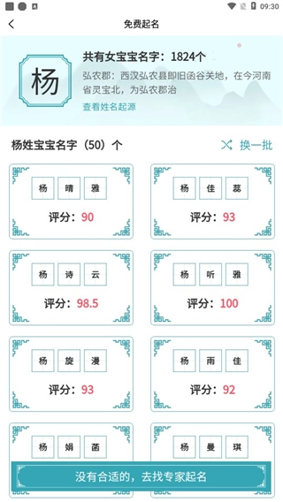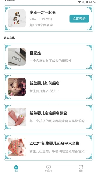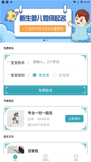 用户能够输入宝宝的姓氏,接着点击免费取名来获取名字,也可以预约专家进行一对一起名服务。