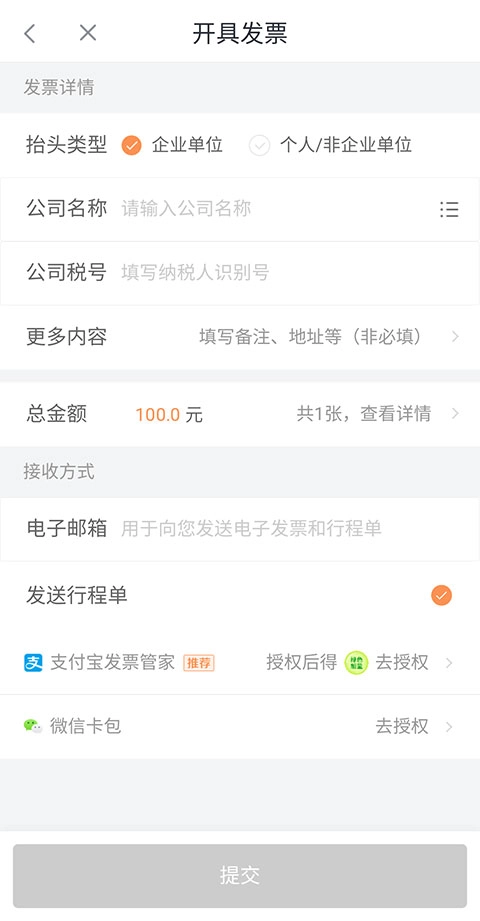 在订单列表里找到需要开具发票的那笔订单,准确填写发票抬头信息和接收发票的电子邮箱,确认无误后点击页面下方的提交按钮就完成操作了。