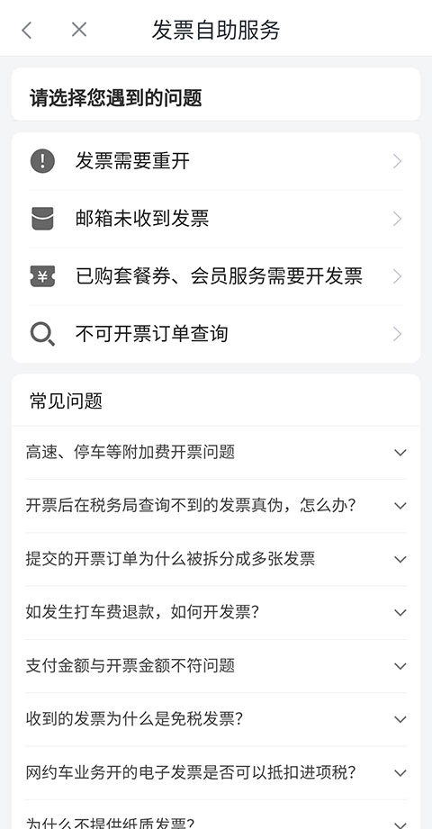 若在开具发票时碰到问题,可点击【发票自助服务】,查找相应的解决方法。