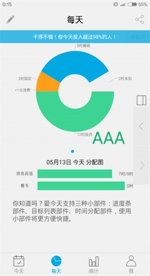 如果你正在寻找一款能帮你管理日常时间的工具,不妨试试这款名为“爱今天”的应用。它可以让你记录每天的各项活动及对应的时长,系统会自动生成直观的统计图表,让你清楚了解时间的分配情况,从而更合理地规划日程。这款软件不仅占用空间小,而且界面简洁易用,记录操作十分便捷。有时间管理需求的用户,不妨体验一下这款实用的工具。