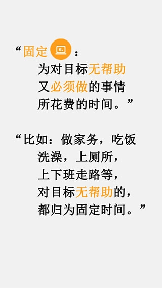 像做家务、洗澡、上厕所这类对达成目标没有帮助的活动,都可以归类到固定时间里。