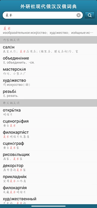 打开该应用后,用户能通过搜索功能查询词汇,系统允许输入中文或俄文进行检索。