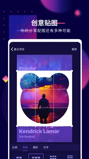 支持对图片进行多宫格裁切操作,用户还能自主设定切图比例,同时具备添加图形、文本等辅助功能。