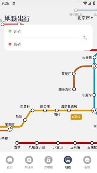 4、进入地铁出行界面后,输入起点和终点即可查询地铁路线,操作简便。