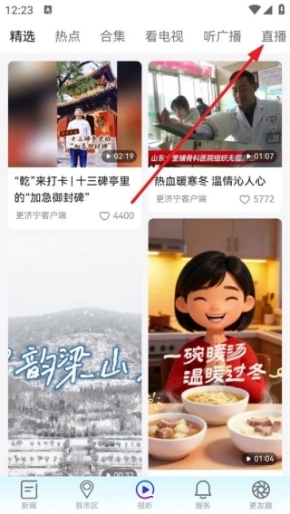 2、进入视听界面后,点击顶部的“直播”选项,这里会展示各类精选视频内容。