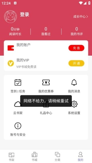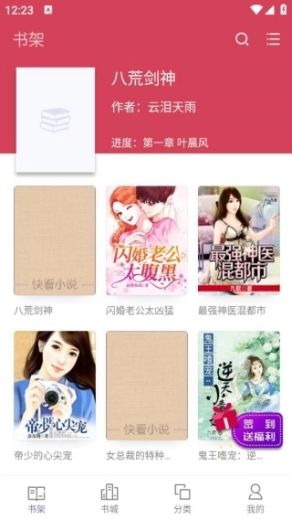 1、登录后进入书架页面,就能查看推荐的书单并直接开始阅读
