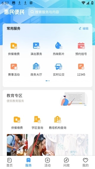 2、服务专区设有便民服务入口,涵盖餐费缴纳、演出购票等实用功能,教育板块也同步提供在线缴费服务。