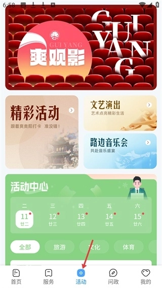 3、活动中心推出观影优惠、文艺演出等特色活动,支持按日期和类别筛选查看,活动信息一目了然。