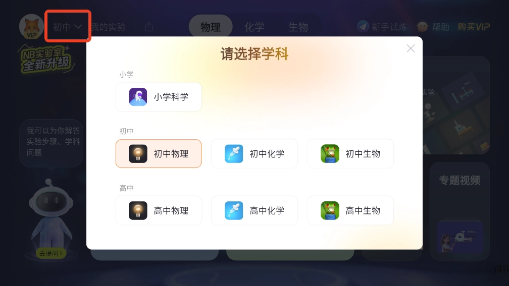 例如你要做物理的试验,点击教材同步栏的开始试验。