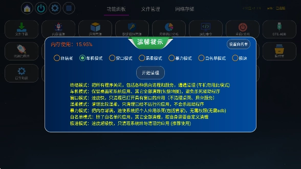 2、拿其中的清理内存功能来说,先点开并选择合适的清理模式,接着启动清理流程
