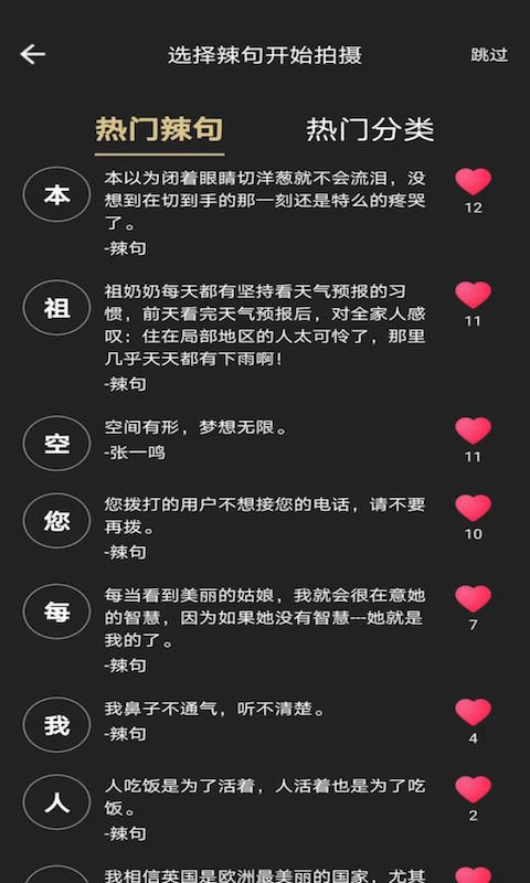 在这里,你可以看到超多金句:吃的、搞笑的、钱、爱情、生活、旅行、爱国、创业、酒、人生、影视、歌曲…金句应有尽有,你喜欢的金句都在辣句!