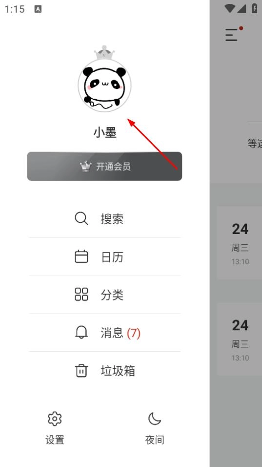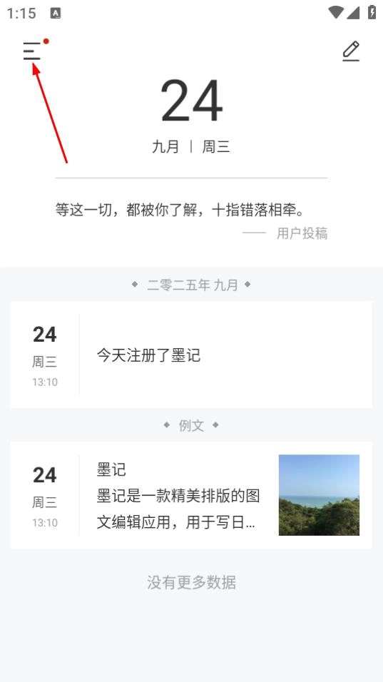 打开墨记应用后,点击界面左上角的菜单图标,即可展开侧边栏。