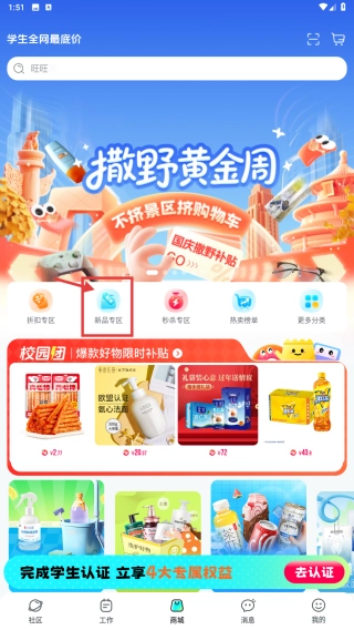 打开学生特惠购物页面,点击新商品选项,进入新商家专区页面。