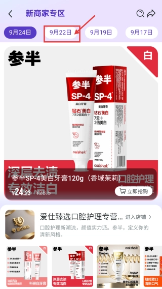 你可以在新商家专区里,找到并点击9月22日的日期标签,这样就能看到当天对应的商品列表了。